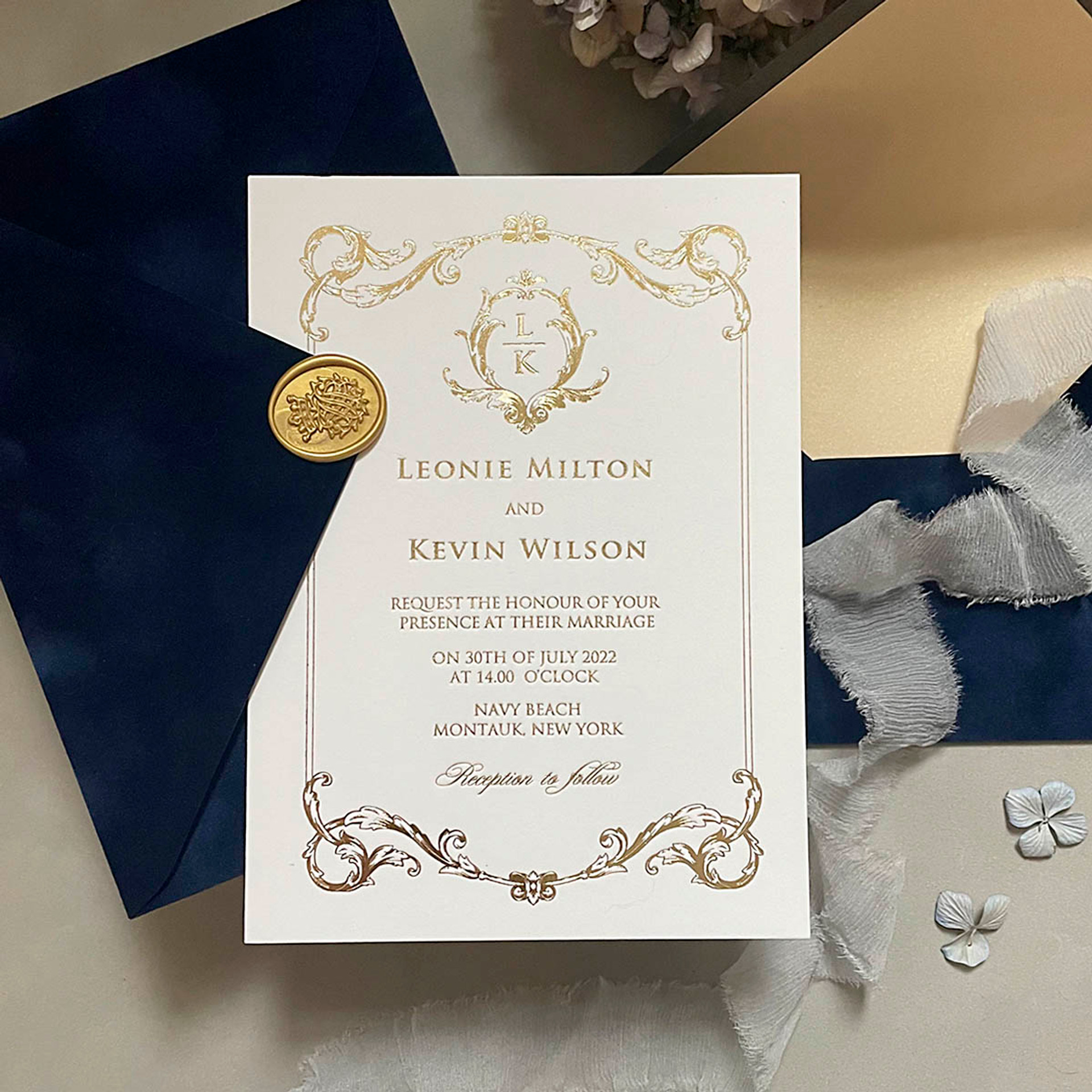 Our collection embodies a timeless aesthetic, combining classic materials like suede velvet paper, subtly textured cotton board, and semi-transparent vellum paper with the artful techniques of foil press and letterpress. These methods elevate our gold foil wedding invitations to a level of elegance that transcends the ordinary. The metallic shimmer of foil exudes a sense of opulence and luxury that digital printing simply cannot replicate.